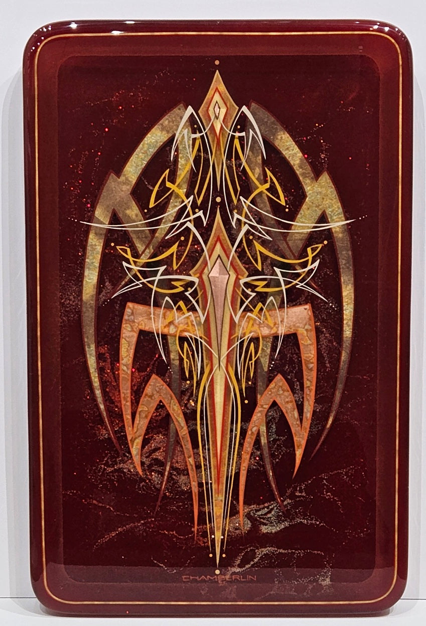 After curing, the surface is sanded and a tribal-inspired form is gilded with variegated leaf, then outlined and sealed beneath clear resin. Diamond shapes are introduced over time, each suspended at a different depth. Pinstriping in yellow and ivory is added in measured stages, with select diamonds crossing over the linework so color, metal, and line interact through the layers. A final diamond form in copper leaf brings warmth and contrast near the surface.