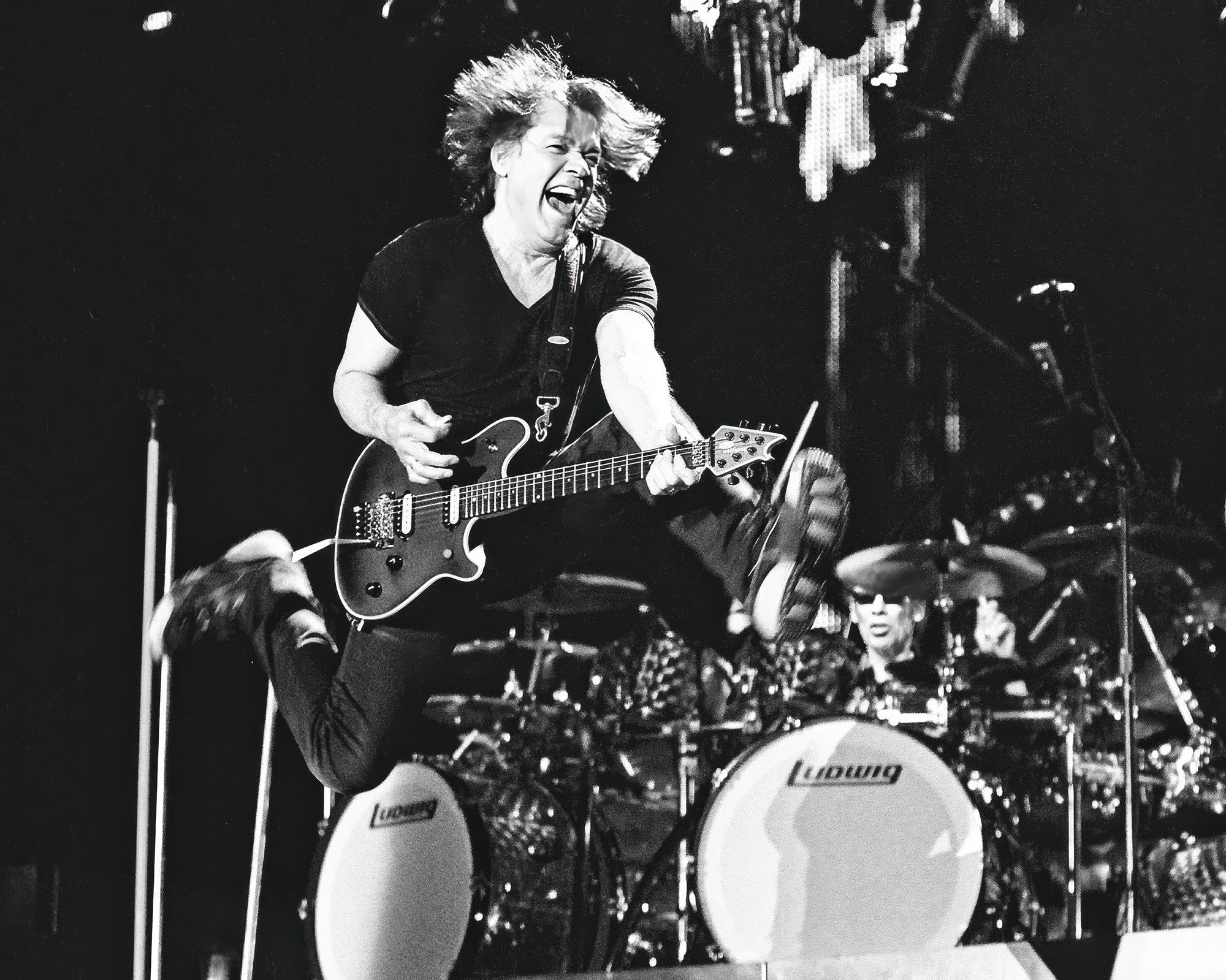 Eddie Van Halen ' Jumping ' while Alex Van Halen on the drums watches in the background.