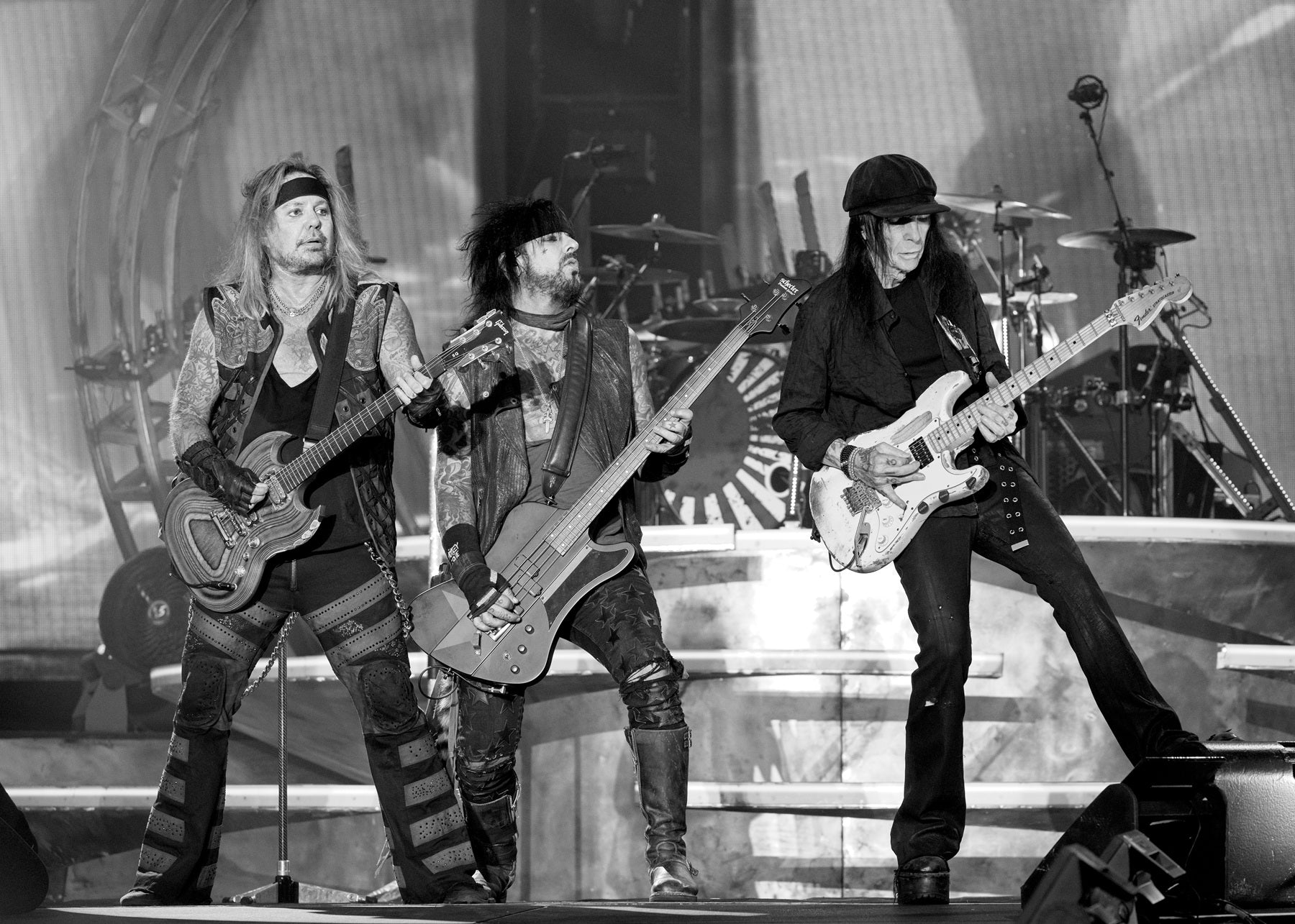(L-R) Vince Neil, Nikki Sixx and Mick Mars of Mötley Crüe performing on stage at Hersheypark Stadium, Hershey, PA. as part of The Stadium Tour.