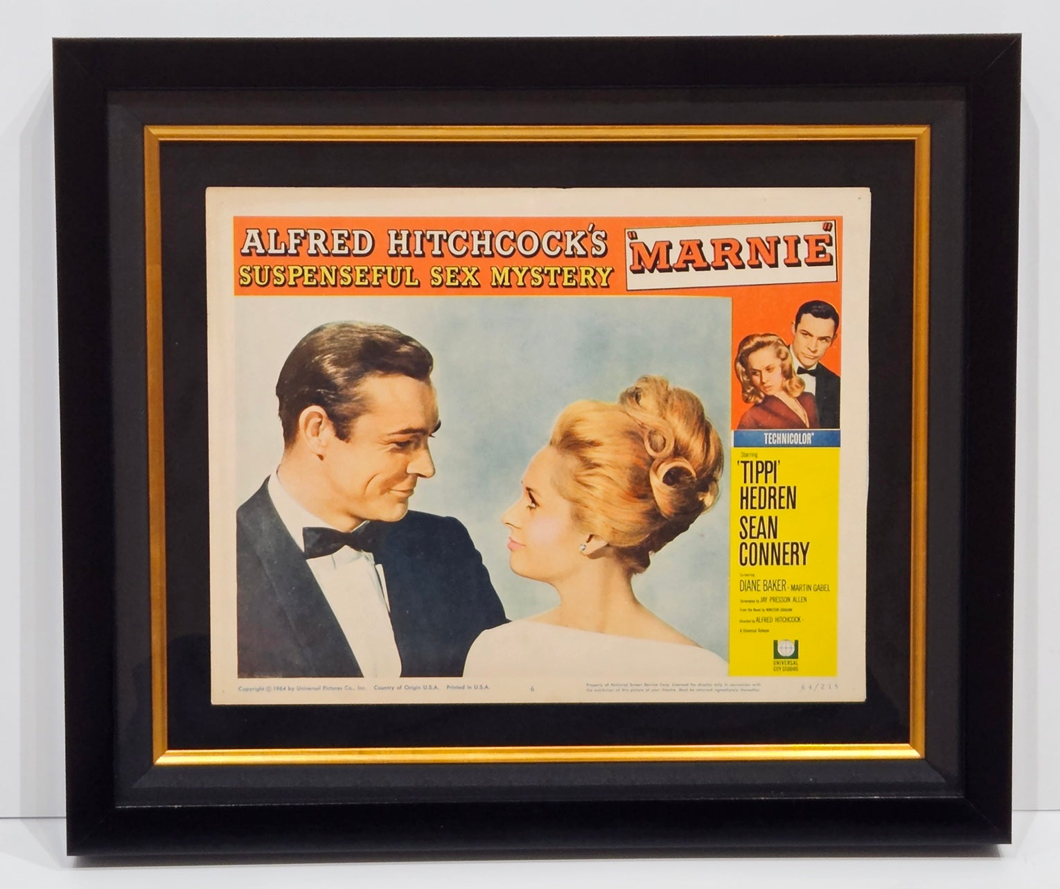 Rare original used theatrical lobby card for the 1964 movie " Marnie ", starring Tippi Hedren and Sean Connery.
