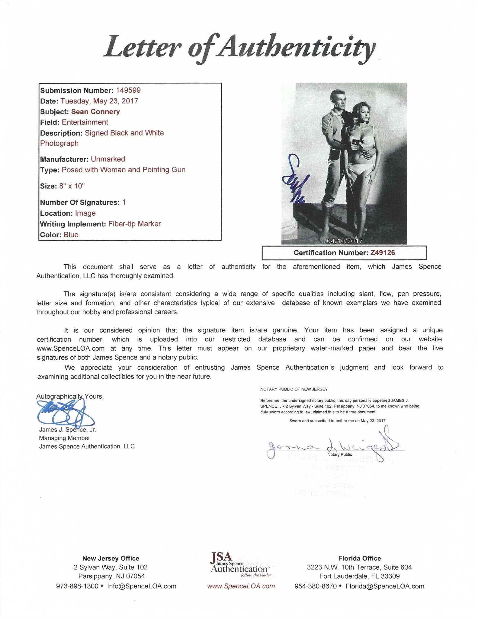 Sean's signature has been James Spence authenticated and is accompanied with a Spence Letter of Authenticity.