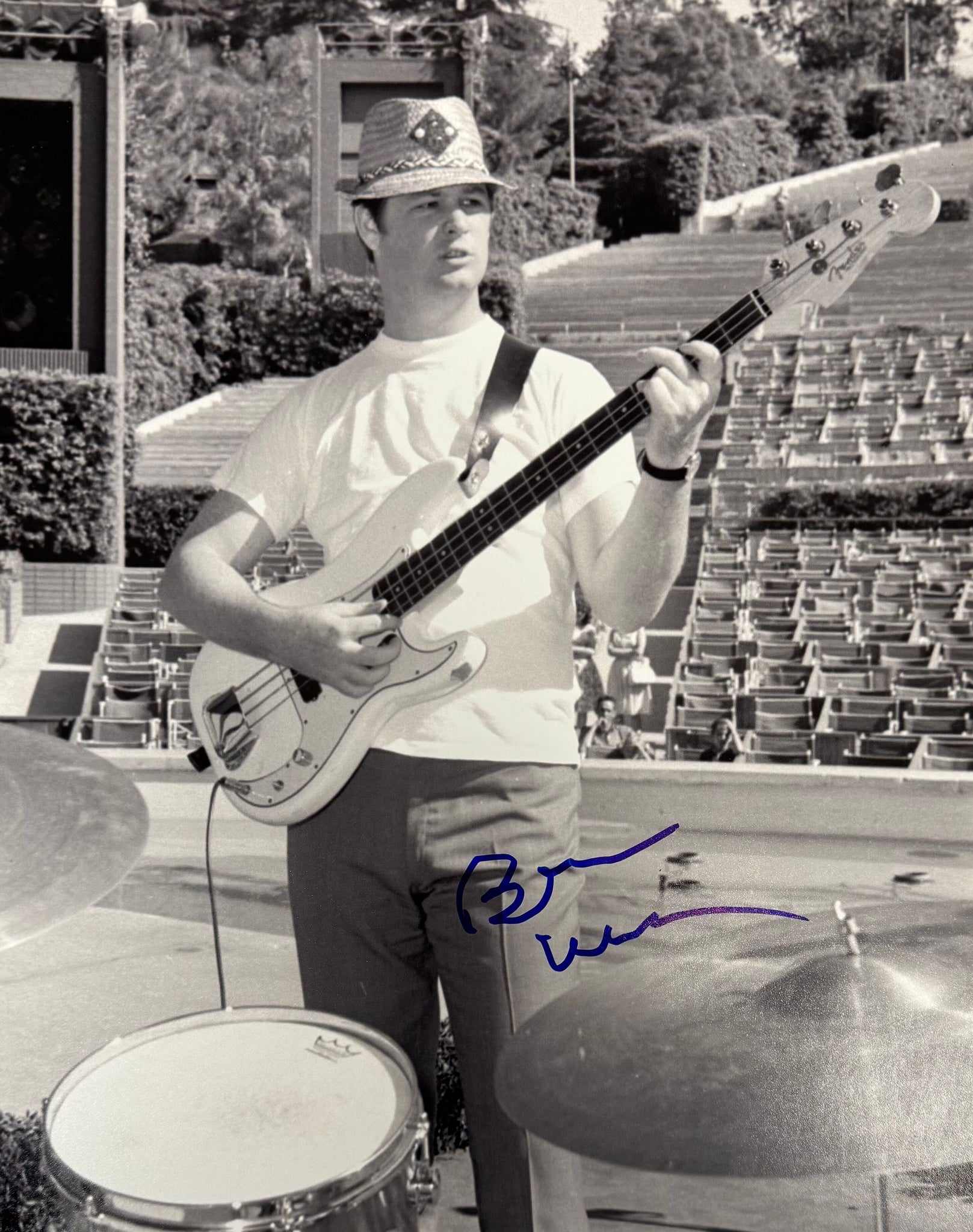 An 11” x 14” large glossy photograph hand-signed in blue marker by the late Brian Wilson.