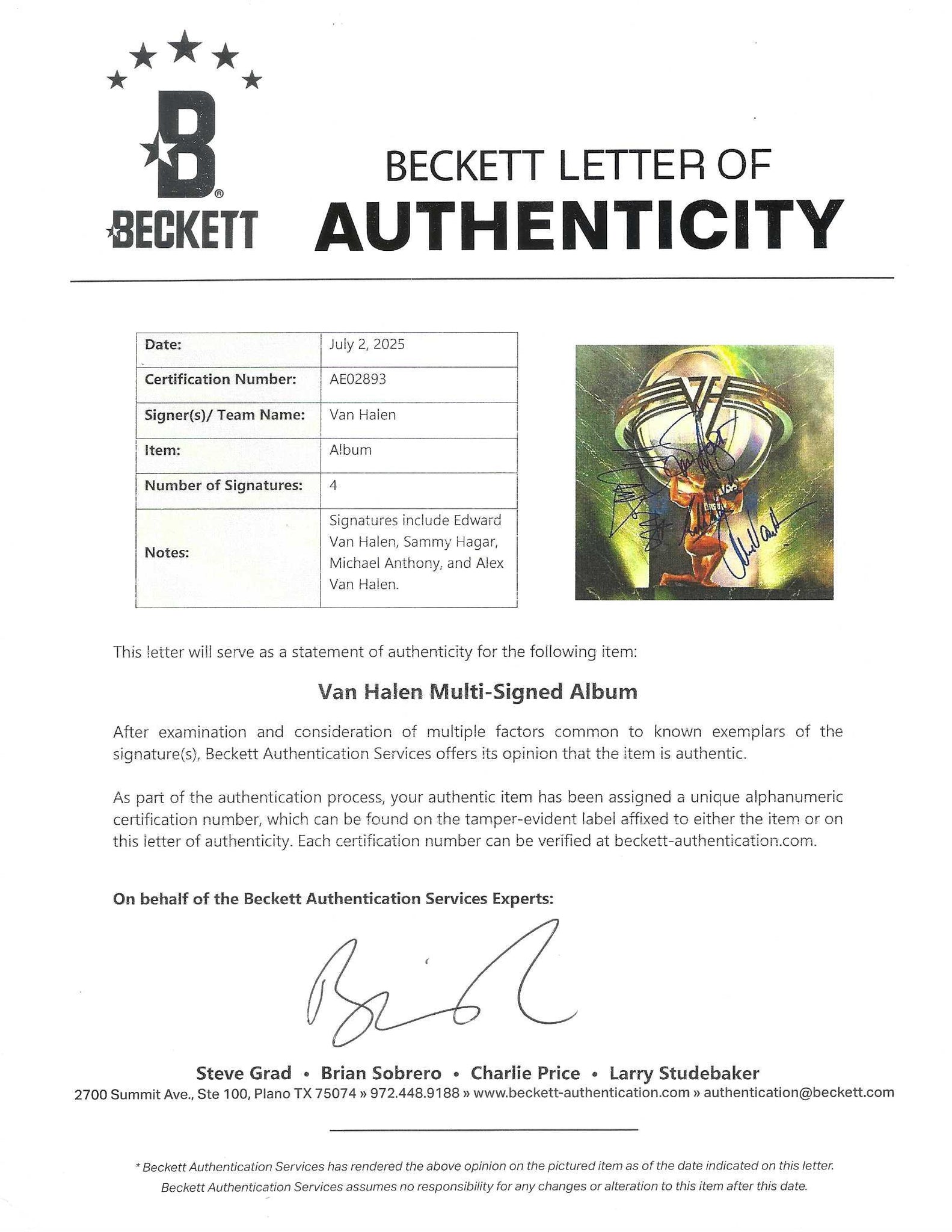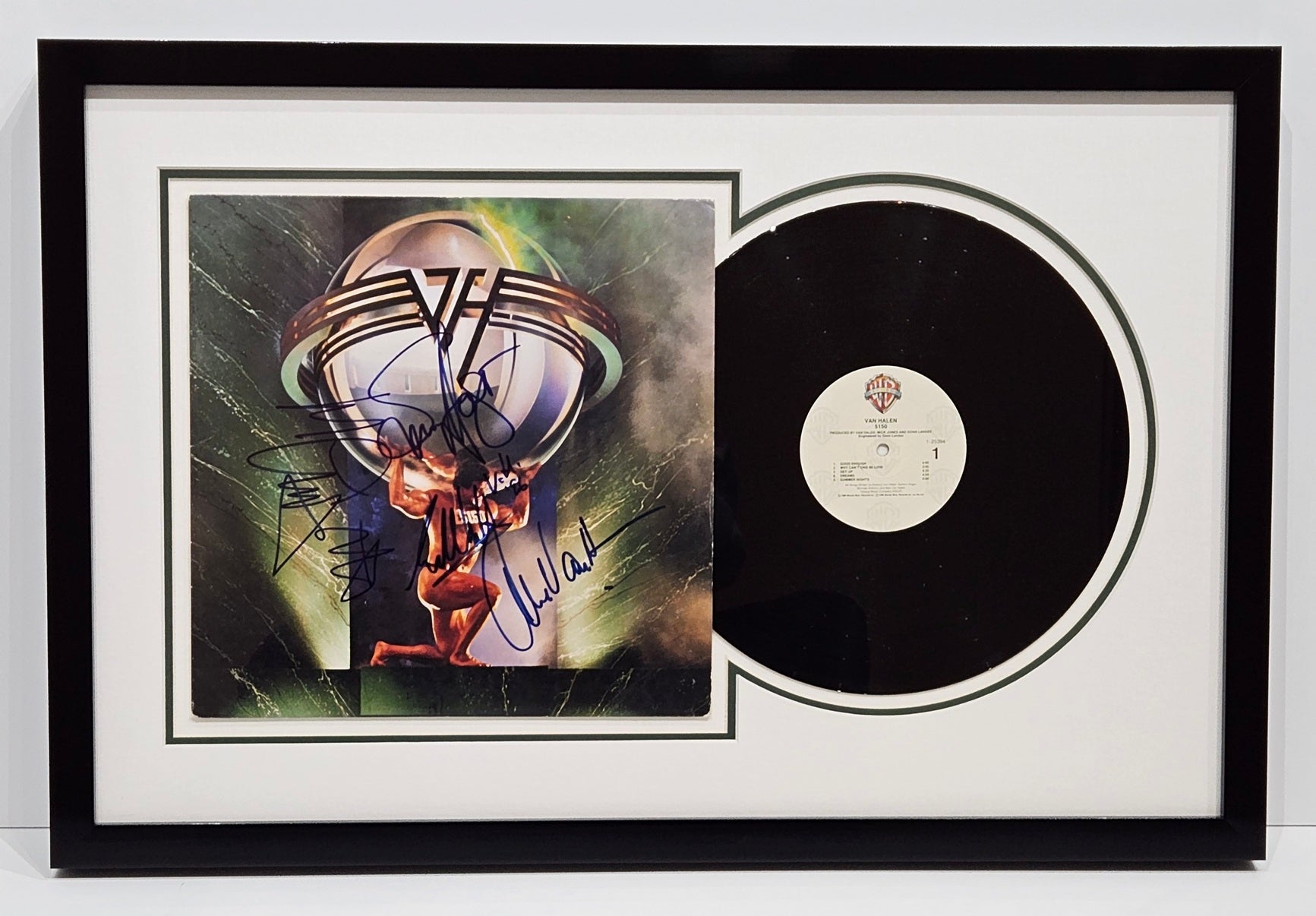 5150 album cover strikingly signed in blue marker by Sammy Hagar, Eddie Van Halen, Michael Anthony, and Alex Van Halen.